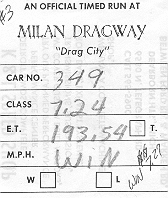 ![]() Hey, we did break into the 4's! Of course, it was an eighth-mile track. Note the speed was only 40mph off our quarter-mile speeds. |